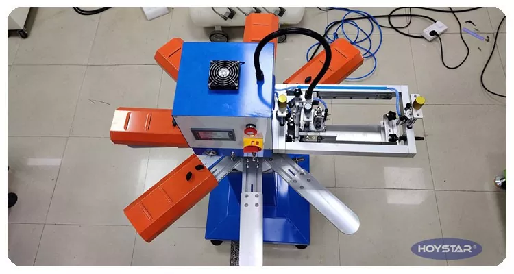 5.10 statio gyratoria operabilis optimized pro efficientia: 2 statio pro loading/unloading, 1 statio ad imprimendum, 5 statio ad siccandum. Cum 8 statio currit eodem tempore.