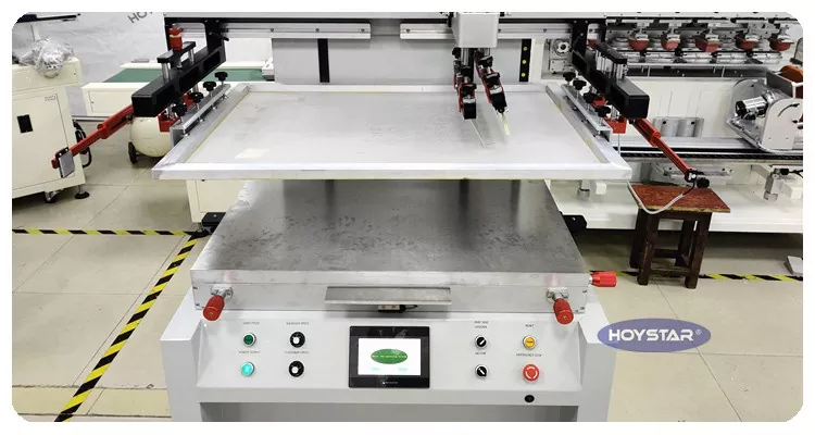 Semi Automatic Screen Printing Machina Flatbed with a PLC and touch panel screen, operatio intuitive — even for new users. Interface facile concedit componendi celeritatem imprimendi, modum imprimendi, etc.